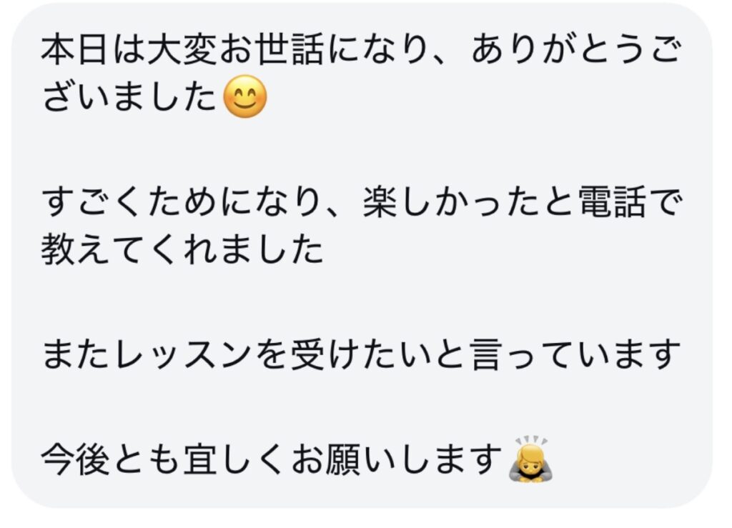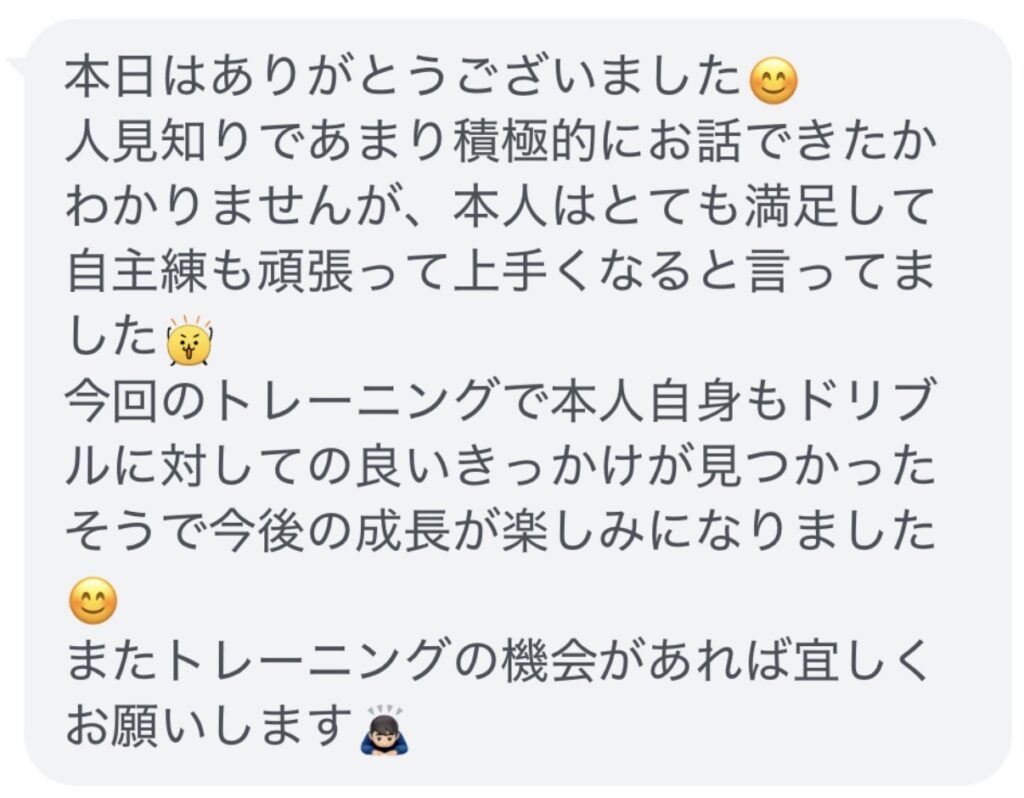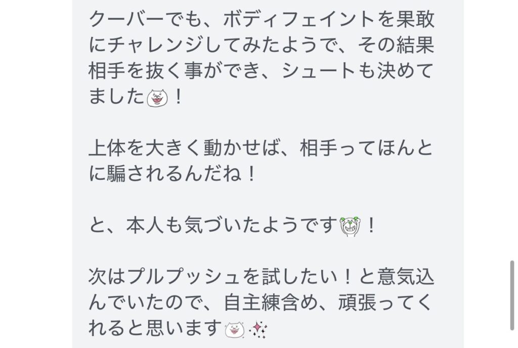 レッスン後、かなたコーチが当日のプレーを振り返り、お子様専用の冬休み強化ポイントをまとめたレポートをLINEでお送りします。