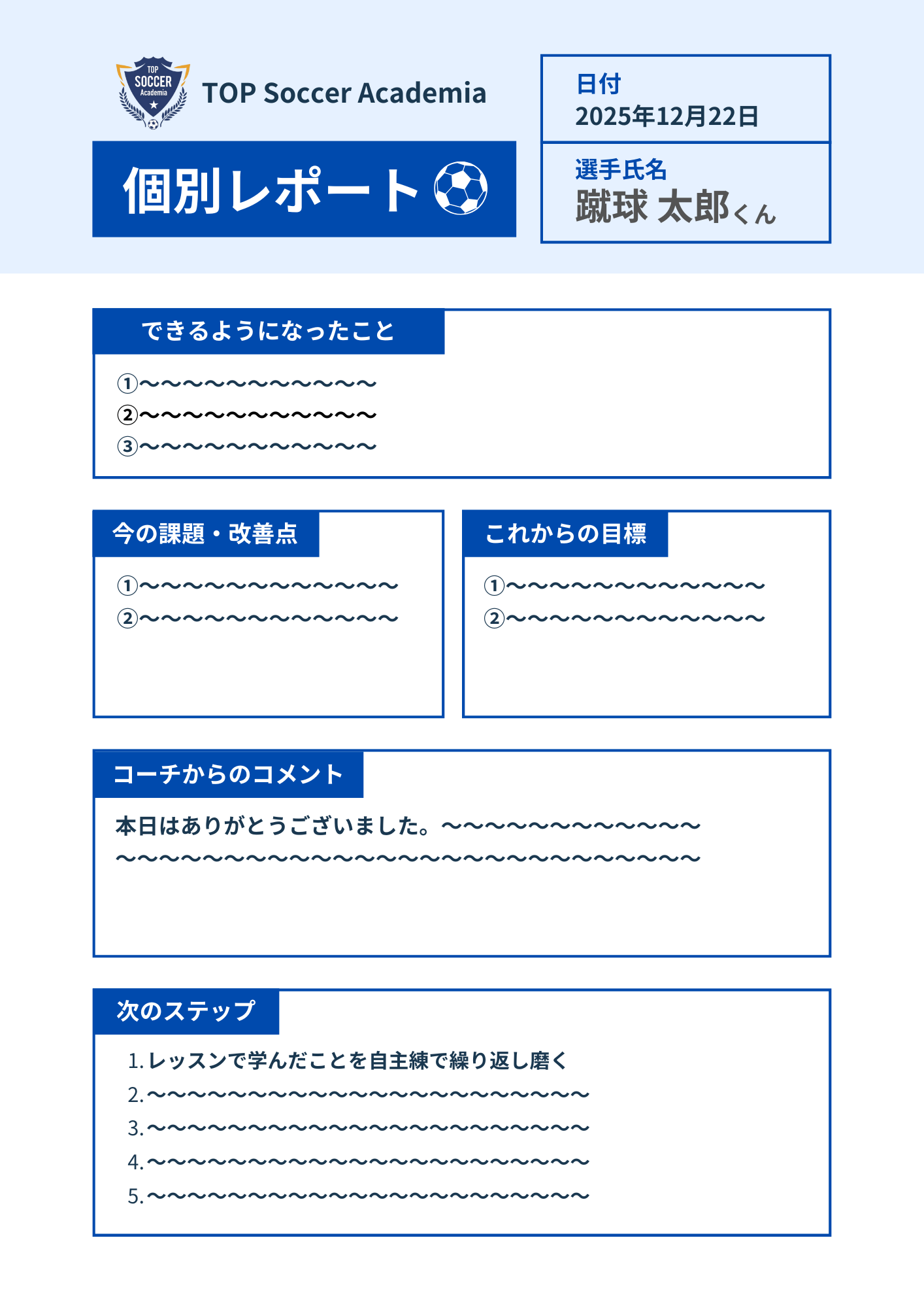 レッスン後、お子様の「武器」と「課題」をまとめた個別レポートをプレゼント。のべ350名以上個別レッスンをしてきたプロが、お子様の課題や武器を分析し、2026年の行動指針を作成いたします。